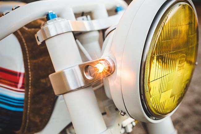 The details are pretty impressive, the bike has been fitted with the 120/18 Beck Whitewalls which sit on BMW R65 18″ wheels.