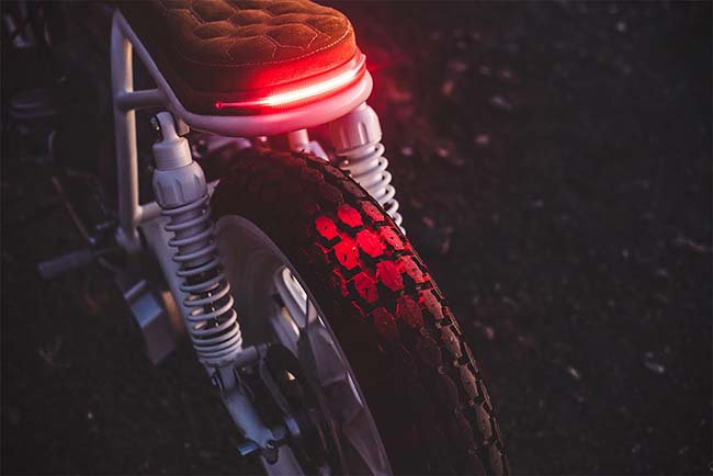 Say hello to BMW R80 Skyway Boardracer, a custom motorcycle created by California-based custom bike specialist Jeremy Hutch. Inspired by BMX bikes from the 1970’s and 1980’s the bike features a Mexican-blanket style paint job that recalls BMW’s racing colours, with a custom handmade seat and tank covered in Napa suede with hexagonal stitching.