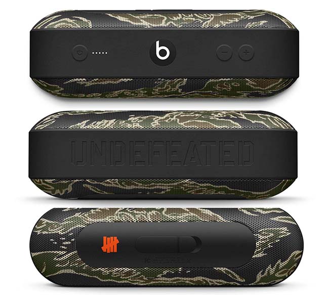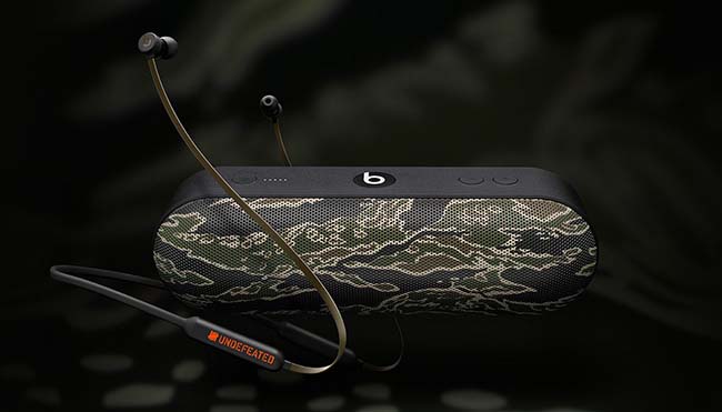 Undefeated has teamed up once again with Beats By Dre for a new series of products featuring a tiger camouflage design. The new capsule collection includes a new Beats Pill+ speaker in familiar tiger camo and matte black, while the Beats X headphones get wrapped in an olive colorway with black on the cord, alongside orange branding.