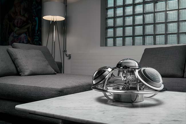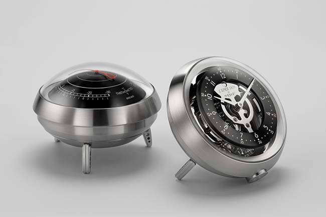 Maximilian Büsser & Friends teamed up once again with Swiss manufacture specialized in high-end clocks L’Epée 1839, to create this intergalactic horological weather station – The Fifth Element. Inspired by fantasies from classic UFO films, books, and comics of the 1950-60s, the weather station features four removable and interchangeable instrument elements clock, barometer, hygrometer, and thermometer – with Ross, the alien pilot, rotating around the UFO’s cockpit.