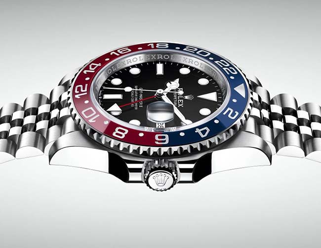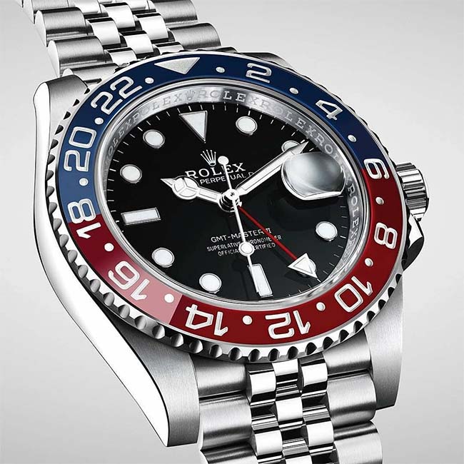 Price for the irresistible Rolex GMT-Master II Pepsi in Oystersteel and on the Jubilee bracelet is 8,800 CHF (approx $9,250 USD).