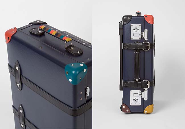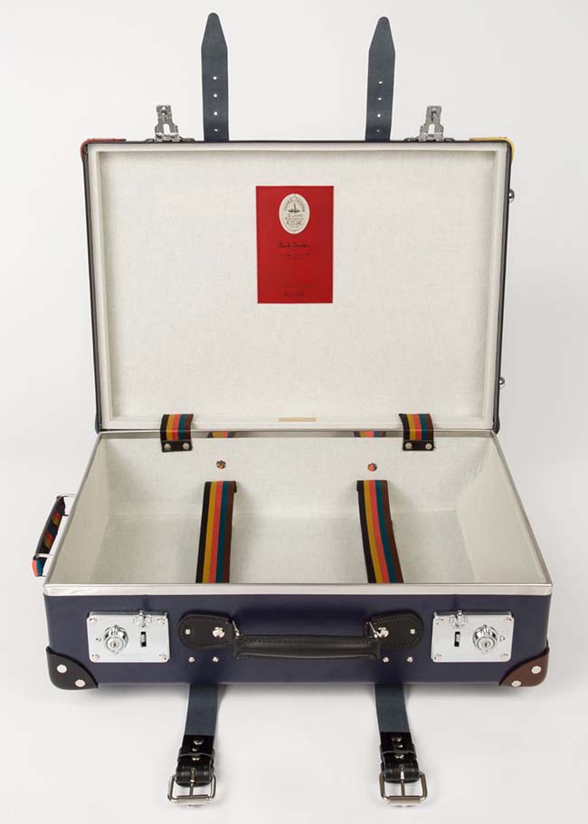 Renowned British designer Paul Smith teamed up with Globe-Trotter to create the ultimate British suitcase. Sir Paul Smith has added his trademark colourful Artist Stripe to the classic 20″ navy trolley case handles and inner straps.