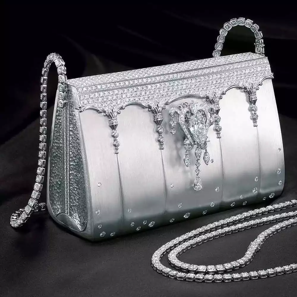 Designed by celebrated Japanese jeweler Ginza Tanaka, this one-of-a-kind creation redefines luxury. The bag is made from solid platinum and set with more than 2,000 dazzling diamonds. Ingeniously designed, the diamond-studded strap transforms into a necklace or bracelet, while the 8-carat pear-shaped diamond centerpiece detaches to become a brooch. Every element is both wearable and exquisite.