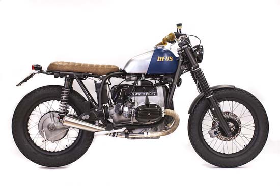 Another awesome custom bike by Deus Ex Machina called “Steve R100”. Based on a BMW R100/7, the Steve R100, is deserving of the notoriety that Deus has in customizing motorcycles. According to the design team, the goal was to create something “smooth and simple” and all I can say “it is”. The project took an astounding five months to complete, and features a number of handmade parts: alloy tank with Monza Cap, rear frame, and alloy fenders; Dedicated leather saddle, New electrical system , Six Days front lamp , Cocker Tyre, Sprint Filter cone filter. The custom paint job was made by Kaos-Design. Check out the impressive design below and