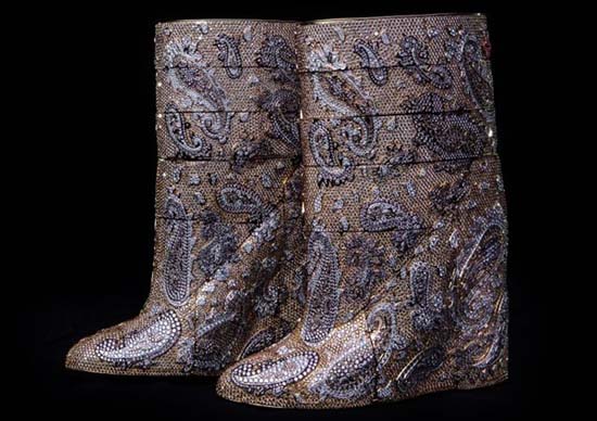 Belgian fashion label AF Vandevorst collaborated with Diarough/UNI-Design, an Antwerp-based diamond company, to create a pair of diamond ankle boots valued at $3,188,000 million. The calfskin boots, which come in size 39 (European) are studded with 38,883 natural fancy colored diamonds, 4,783 grams of gold and all the process from creation to manufacturing took over 30,000 hours. Unveiled during the Business Of Design Week in Hong Kong in